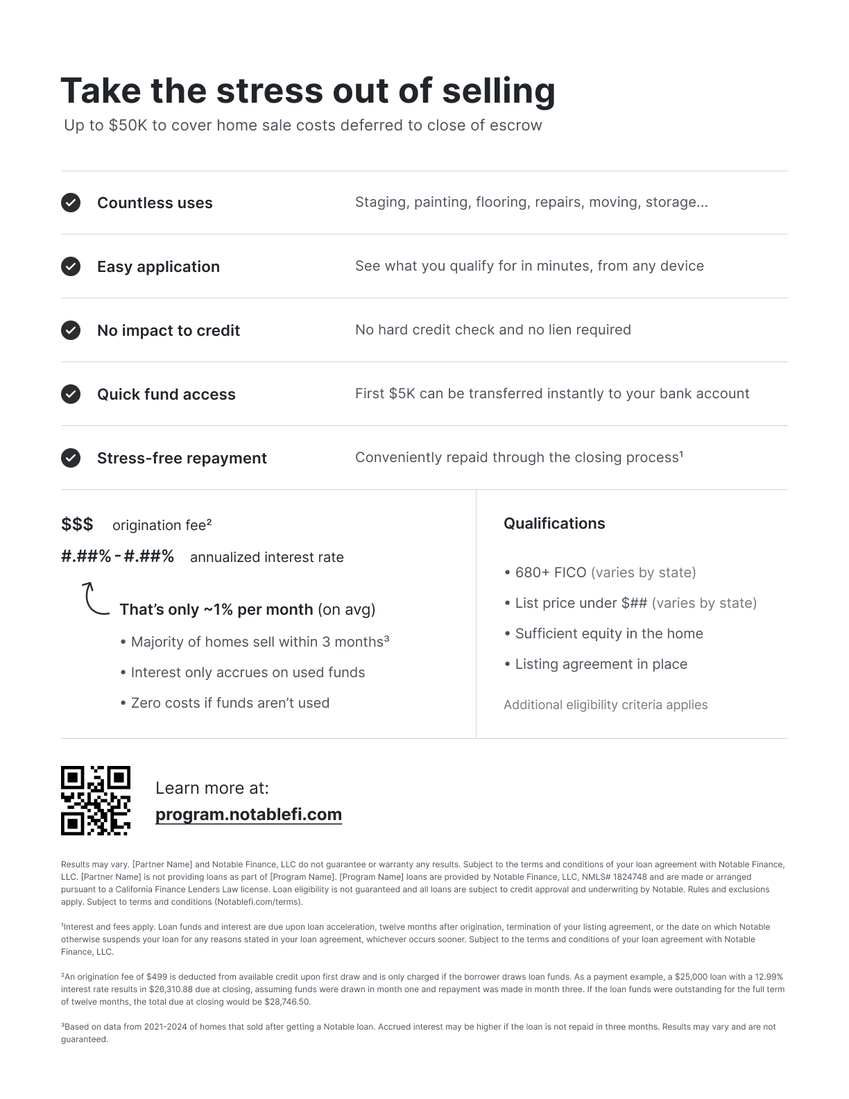¹ Interest applies. Loan funds, interest, and fees are due upon closing of the sale of your home, termination of your listing agreement, loan acceleration or twelve months after origination, whichever is sooner. Subject to the terms and conditions.
